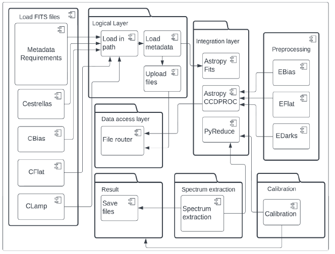 The package diagram in Fig. shows different layers that facilitate FITS file management in an image-processing environment for Echelle spectral reduction. The most basic layer, the FITS file component, is responsible for initial operations such as uploading files and acting as the entry point for raw data. This connects to the logical layer, which implements image loading according to a specified path and metadata management. In turn, a logic layer interacts with a data access layer. This process is responsible for reordering the files according to their specific function, such as bias images, flats, and star or lamp images. It saves the images product of intermediate processes of the integration layer in libraries such as AstroPy, which in conjunction with PyReduce, play a role in pre-processing, spectrum extraction, and calibration, culminating in the production of data ready for analysis and to generate final results.