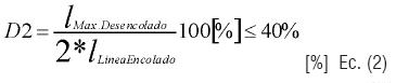 El otro criterio es para conocer el procentaje máximo de desencolado para una línea de encolado en la probeta y será calculado con la fórmula 2 y debe ser ≤ 40%.