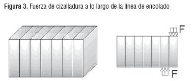 Para el ensayo de la cizalladura se prepararon probetas de 20 x 20 x 49 mm con seis uniones tal como se muestra en la figura 1, y posteriormente se sometieron a una fuerza de cizalladura a lo largo de la línea de encolado tal como se muestra en la figura 3, hasta que la unión se rompa. El criterio de aceptación de la probeta es que el esfuerzo de cizalladura en la unión encolada debe ser ≥ 6N/mm2, y si la cizalla se produce 100% en la guadua debe ser ≥ 4N/mm2.