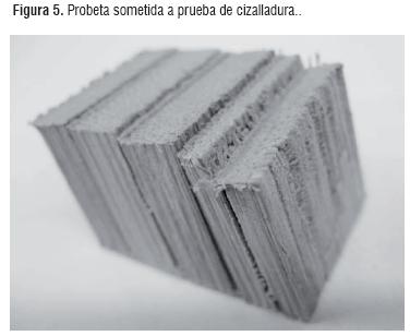 Los resultados de las pruebas de desencolado y cizalladura en las probetas de Guadua angustifolia Kunth fueron muy buenos para las dos pruebas. En la figura 4 se puede observar una probeta de desencolado en la cual las líneas de encolado no se observan separadas, a pesar de las condiciones climáticas a que fue sometida, también se observa el levantamiento de algunas fibras laterales y paralelas por el rigor de la prueba.