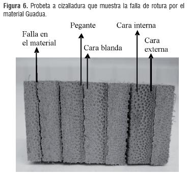 En la Figura 5, se puede observar una probeta sometida a la prueba de cizalladura, en la que se nota el corrimiento de las fibras muy cerca de la línea de unión del pegante, pero en realidad la línea de encolado no falló, la falla se produjo en el material de la guadua lado "i" denominado interior como se observa en la Figura 6. El comportamiento del pegante en la línea de encolado fue excelente.
