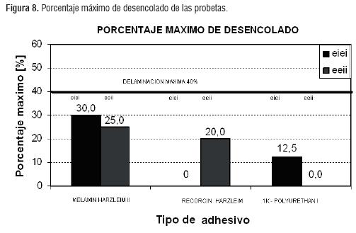 Las probetas pegadas con RECORCIN HARZLEIM presentaron cero desencolado, aunque si se observa, los tres pegantes pasaron la prueba de desencolado. Además, del criterio anterior se puede observar que la combinaciones de uniones encoladas de tablillas exterior - interior; exterior - interior (eiei), y las exterior - exterior; interior -interior (eeii) pasaron la prueba del desencolado con un buen margen de diferencia con respecto al umbral requerido por la norma, de acuerdo a la Figura 8.