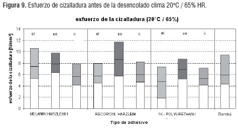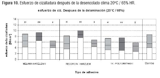 La Figura 9 muestra el comportamiento de la cizalladura de las uniones encoladas de las probetas antes del desencolado en un clima estándar 20°C/65% HR, en donde el esfuerzo de cizalladura de todas las uniones encoladas cizalladas no tiene valores por debajo de 4 N/mm2 excepto las uniones de tablillas en la posición eiei encoladas con el pegante 1K - POLYURETHAN, que tuvo un valor mínimo por debajo de este criterio, circunstancia que permite descartar este tipo de pegante para dicha unión. En los valores promedio se encontró que algunos no cumplieron el criterio de mínimo valor de cizalladura de 6 N/mm2 como son las tablillas encoladas con unión eiei, iiii usando pegante 1K - POLYURETHAN, las tablillas encoladas con unión eiei, usando pegante RECORCIN HARZLEIM y las tablillas encoladas con unión iiii usando pegante MELAMIN HARZLEIM. Se entiende aquí que hubo marcada influencia de la posición de las tablillas al encolado. Se observa como la probeta testigo de material de guadua (Bambú) sin encolar cumple aprox. (5.98 N/mm2) con los criterios de la norma de cizalladura (6.00 N/mm2).