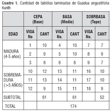 En el Cuadro 1 se muestra el total de tablillas usadas en la investigación, se aclara que para el experimento de vigas encoladas laminadas se trabajó solo con guadua madura. Durante el transporte de las tablillas hasta el BFH, las condiciones de contenido de humedad cambiaron, por lo tanto, se les realizó un tratamiento de climatizado, para obtener un contenido de humedad de equilibrio de 13% < a 15% de acuerdo a norma [3], climatizando las muestras a 20°C, 65% HR.