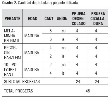 Para el pegado de las tablillas se utilizaron tres tipos de pegantes [11] [12] [14], un número de 48 probetas pegadas de diferente manera entre las caras, como se muestra en el cuadro 2.