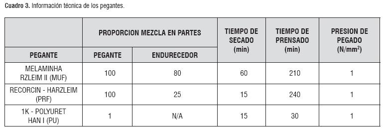 El proceso de pegado de las tablillas se hizo siguiendo las recomendaciones de las hojas técnicas de los fabricantes de los pegantes y aplicando la norma DIN EN 386 con una presión de encolado entre 0.6 - 0.8 N/mm2 para maderas blandas. Dado que la guadua tiene una dureza mas alta se aplicó una presión de 1 N/mm2, ver Cuadro 3. El tiempo de secado en dicha tablilla se entiende entre aplicar el pegante y aplicar la presión. Una vez pegadas las tablillas y conformadas en vigas, se procedió a preparar las probetas para los ensayos de desencolado y cizalladura en el número veces como se indica en el Cuadro 2. Aplicando las normas [3] (DIN EN 391) y [4].