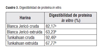 La digestibilidad de proteína in vitro disminuyó de harina sin extruir a harina extruida variedad Blanca dulce de Jericó un 23,05% y de harina sin extruir a harina extruida variedad Tunkahuan un 26,70%. Posiblemente el tratamiento térmico provocó entrecruzamientos proteína-proteína derivándose en enlaces isopeptídicos que no son reconocidos por la enzima pepsina permitiendo así una disminución de la digestibilidad.