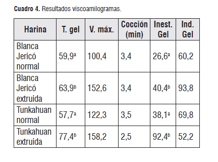 Cuadro 4Temperatura de gelatinización (T. gel). Presentó un aumento significativo (P<0,05) en las harinas, pues durante el proceso de extrusión la acción de cizalla, alta presión y temperatura aplicada a estas [16], produjeron una ruptura de la estructura granular del almidón [17].