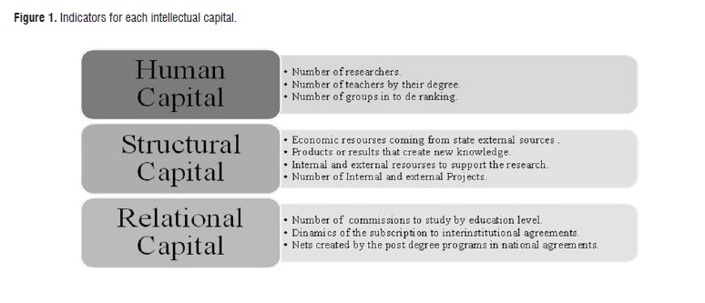 As it has been said, the assessment method proposed by the National University of Colombia, replicated to other universities of the country, identifies research capacities using variables created within the framework of Intellectual Capital; one hand the human capital, relating to knowledge, skills, values and attitudes of people, the structural capital, related to formal and informal organizational structure, methods and procedures of work, specialized software, products of the R&D, management, and culture systems and relational capital variables, or those that have to do with the set of relations that the institution has with its environment see Figure 1