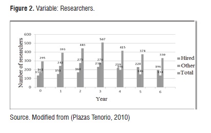 After analyzing the simulations and evaluate policies considered in each scenario, it is relevant to support the alternative of stage two, i.e., that situation where the University decides to increase the rate of dedication of In addition to these models, there are significant contributions to the modeling and simulation of scientific capacities in Colombia, like the one provided by Ruiz, et al (Ruiz, Bonilla, Chavarro, Orozco, Zarama, & Polanco, 2010), which proposes a framework that recognizes the underlying relationships between scientific production variables and the efficiency by discipline, through the use of Bayesian Network (BN) analysis.