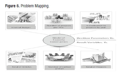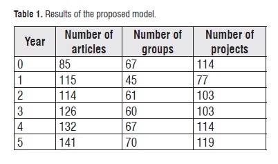 It is also of remarkable importance the contributions of Cortés (Cortés Sánchez, 2016) and the ones provided by Ahrweiler, Pyka and Gilbert (Ahrweiler, Pyka, & Nigel , 2004) about the Efficiency in the use of digital data bases for the scientific production in universities in Colombia and Simulating knowledge dynamics in innovation networks (SKIN), respectively. The Phd professors to research by 25%. In this scenario, the behavior of the production of scientific articles is encouraging, and the dynamics of growth of the ranked groups and projects is representative.