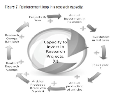 Figure 7The research capacity composed by the number of projects per year and the annual investment also contains a reinforcement loop corresponding to the amount of the investment. It is to be expected to find cycles of compensation. However, given the relative maturity of the unit of analysis and the limited period of time, it was not possible to observe this phenomenon yet. Future research can show the occurrence of them.