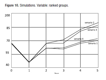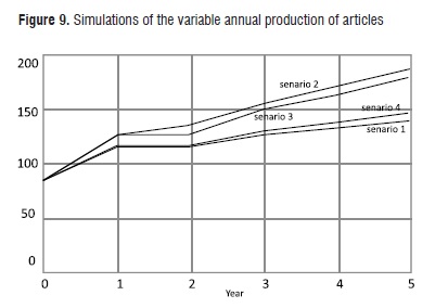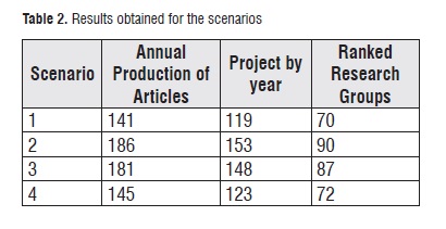 Table 2Figure 9 illustrates the behavior of the variable annual production of articles and Figure 10 corresponds to the ranked research groups simulations. For the annual production of articles, this research capacity indicator shows an improvement over the base line for the 3 remaining scenarios.>