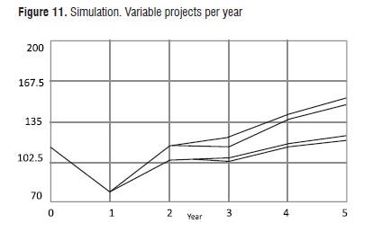 Figure 10 shows that the number of ranked groups improves at the second year, being also more effective to increase the dedication of Phd professors to research. Figure 11 shows the behavior of the variable projects per year in four stages. It is evident a growth of this variable mainly after the second year. The best scenario for strengthening the capacity is scenario two.