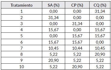 Se empleó un diseño de mezclas, para evaluar el efecto de tres ingredientes y sus combinaciones: salvado de avena (SA), polvo de cáscara de piña (CP) y copos de quinua (CQ); en el 31,34% de la formulación base sobre el contenido de proteína, fibra dietética total, firmeza, aceptabilidad general y compuestos fenólicos con un total de 10 tratamientos como se observa en el Cuadro 2, los mismos que fueron corridos en tres repeticiones. El análisis de varianza, se aplicó con un nivel de confianza del 95%, para validar los modelos obtenidos se consideró R2>0,80, valor p<0,05 y la falta de ajuste mayor a 0,05. Se utilizó el programa Minitab Statistical Software, versión 17,0 (Minitab Inc., 2014) para obtener las ecuaciones, generar las figuras de superficie de respuesta y optimizar las variables independientes.