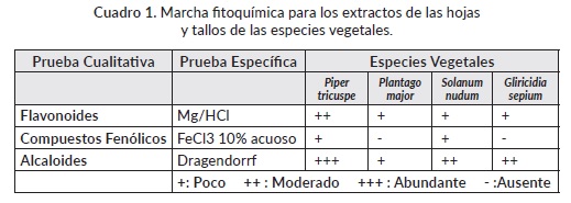 Los resultados de la marcha fitoquímica indican la presencia de flavonoides en los extractos de las cuatro plantas estudiadas, presencia de compuestos fenolicos para P. tricuspe, S. nudum y G. sepium. En cuanto a la presencia de alcaloides, se presentó poca cantidad en P. major, para la especia P. tricuspe, en la cual se observó una abundancia de estos metabolitos (véase cuadro 1).
