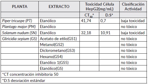 Con respecto a la citotoxicidad, los extractos etanólicos de P.tricuspe y S.nudum (PT y SN) presentaron una baja toxicidad de 41,74 y 32,18 mg/mL respectivamente, en la línea celular HepG2, según la clasificación dada por el grupo Malaria; los extractos de P. major y de G.cepium, no tuvieron actividad tóxica sobre la línea celular trabajada a las concentraciones evaluadas, los resultados de estos extractos no se evidencia en el cuadro, debido que los investigadores consideramos no son de relevancia. (Cuadro 2).
