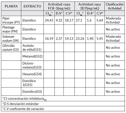 Actividad Antiplasmodial. La evaluación de la actividad antiplasmodial de los extractos fue efectuada in vitro con cepas 3D7 (sensible a cloroquina) y FCR3 (resistente a cloroquina) de Plasmodium falciparum, las cuales fueron mantenidas a un cultivo continuo a 37°C en una atmósfera de mezcla de gases de 5% de O2 6% de CO2 y N2 balanceado, según lo descrito por Trager W, et al 1976 [35], con algunas modificaciones [36,37].