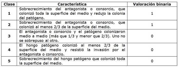 Se realizaron pruebas de antagonismo contra el fitopatógeno a través de la técnica dual [32], con las tres cepas de Trichoderma sp. (Tr1, Tr2 y Tr3) y las tres cepas de Aspergillus sp. (As1, As2 y As3). También, se evalúo el antagonismo entre ellos, así: As1 vs. Tr1, As1 vs. Tr2, As1 vs Tr3, As2 vs. Tr1, As2 vs. Tr2, As2 vs Tr3, As3 vs. Tr1, As3 vs. Tr2, As3 vs Tr3. En cada caja de Petri se marcó una línea para dividir en dos partes iguales el área de siembra, y en la mitad de cada lado se dispusieron discos de medio de cultivo con micelio de los hongos a enfrentar de 5 mm de diámetro [33]. Los quince antagonismos se incubaron por diez días a 25°C. Cada enfrentamiento se realizó en los medios PDA, Jugo V8 y Miel-Avena. La evaluación se realizó de acuerdo con Bell et al. (1982), referenciado por Corrêa et al. [34]; y se modificó cuando se enfrentaron los posibles biocontroladores teniendo la escala de notas No. 1 (Cuadro 1 y Figura 1), con base en el método de similaridad de Jaccard [35].