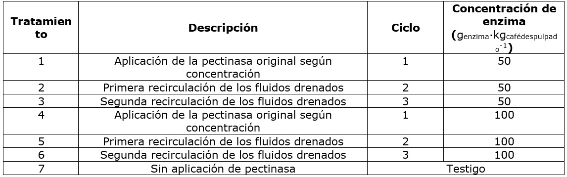Se utilizó un Diseño de Bloques al Azar en arreglo factorial 2x3+1, siendo los factores la concentración de enzima (50 y 100 mgenzima∙kgcafédespulpado -1) y el ciclo de uso de la enzima: la aplicación de enzima original y hasta dos recirculaciones de los fluidos drenados para degradación enzimática de nuevas tandas de café despulpado, con un testigo o control absoluto que fue la fermentación natural (sin aplicación de enzima), para un total de siete tratamientos (Cuadro 1). En total se realizaron 10 bloques, considerando como factor de bloqueo la calidad de la masa de café, la cual fue caracterizada por estados de madurez, tomando una muestra compuesta de 1kg, para determinar el porcentaje de frutos inmaduros, maduros y sobremaduros. La masa de café de cada bloque se dividió en siete partes iguales, que fueron asignadas aleatoriamente a los tratamientos. Las unidades de trabajo estuvieron conformadas por 40 kg de café despulpado. Una vez finalizada la degradación, cada unidad de trabajo se lavó separadamente con un equipo Ecomill® LH-300 y fue llevada a secado solar hasta alcanzar una humedad entre 10 y 12 % en base húmeda (b.h).