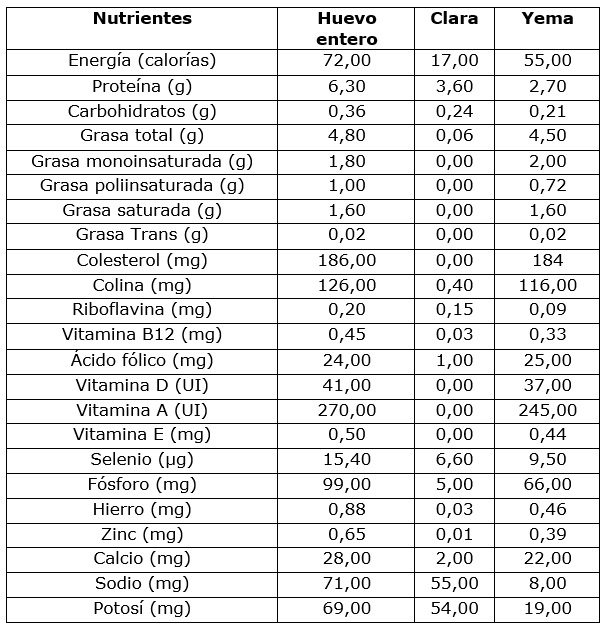 El huevo es un alimento con importante contenido de nutrientes para el organismo, particularmente proteínas, lípidos, minerales y vitaminas de alta calidad (Lee and Paik, 2019). Se destacan contenidos de proteína (11,0-13,8 %), lípidos (8,5-12,0 %) y agua (74,4-88,7 %) (Hester, 2017; Lesnierowski y Stangierski, 2018; Eddin et al., 2019). La proteína es de alto valor biológico, rica en aminoácidos esenciales, que promueven la síntesis y conservación de la masa muscular, relevante para atletas y adultos mayores; en estos últimos, contrarresta el proceso de sarcopenia, propio del envejecimiento (Lesnierowski y Stangierski, 2018). Las proteínas de la clara son principalmente, ovoalbúmina, ovotransferrina y ovomucoide; además, lisozima, avidina y ovomucina, siendo esta última, la responsable de la viscosidad de la clara (Eddin et al., 2019). El cuadro 1 ilustra la composición del huevo de gallina.