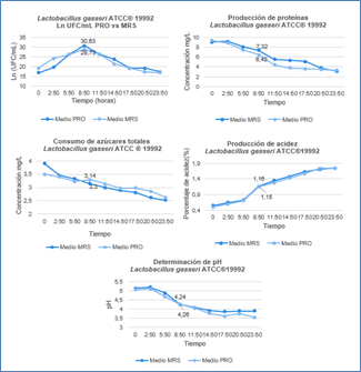 Los resultados registrados para L. gasseri en la cinética de fermentación se encuentran en la figura 1, y permiten concluir que la fase exponencial en los medios MRS y PRO se alcanzó en el tiempo 4 (8:50 horas). El análisis de medidas repetidas mostró que no existen diferencias significativas entre los medios (p>0,05), mientras que el tiempo (horas) mostró diferencias (p<0,05). En este sentido, la interacción no fue significativa entre el tiempo y los medios (p>0,05). En la determinación de pH se pudo observar un valor en la fase exponencial de los medios MRS y PRO de 4,24 y 4,26 respectivamente, el análisis de varianza demostró que existen diferencias entre medios, de igual manera se encontró que existen diferencias entre horas. La producción de proteína en los medios MRS y PRO presentó valores en la fase logarítmica de 7,32 mg/L y 6,42 mg/L respectivamente. El consumo de azúcar en los medios MRS y PRO presentó valores en la fase logarítmica de 3,14 mg/L y 3,3 mg/L respectivamente. En la determinación de porcentaje de producción de ácido láctico, se presentaron valores iniciales y finales de 0,55-1,74 en el medio MRS y de 0,50-1,73 en el medio PRO. Para la velocidad específica de crecimiento µ max (h-1) se encontraron valores de 0,850 y 0,780 y un tiempo de duplicación celular de 48,91 y 53,31 (min) en los medios MRS y PRO.