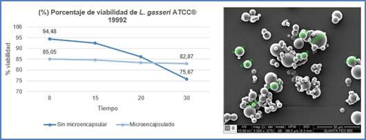 Figura 2 Porcentaje de viabilidad de L. gasseri sin microencapsular y microencapsulada y microfotografía electrónica.