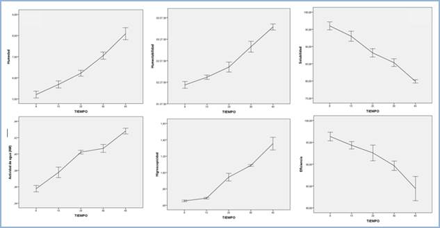 En el proceso de microencapsulación de la cepa láctica resultó determinante no solo la técnica de secado por aspersión, si no, los materiales micro encapsulantes. Este recubrimiento jugó un papel importante en la protección y viabilidad de los microorganismos para incrementar su capacidad de resistir las diferentes barreras fisiológicas simuladas del TGI. Se encontró un tamaño de capsula con un valor mínimo de 2,69 µm y un valor máximo de 12,26 µm, encontrando diferencias significativas entre la cepa sin microencapsular y microencapsulada (p<0,05). Se observó además que existió un descenso de la viabilidad a través del tiempo (p<0,05) (figura 2). En la figura 3 se muestra la tendencia ascendente del porcentaje de humedad (%) con valores iniciales de 5,37 y finales de 8,6, de actividad de agua (Aw %) con valores iniciales de 0,353 y finales de 0,425 %, de humectabilidad (min) con valores iniciales de 2:22 y finales de 3:47 min e higroscopicidad (g humedad/100 g de sólido seco) con valores iniciales de 0,66 y finales de 1,5 g humedad/100 g de sólido seco. A diferencia de los parámetros anteriores el porcentaje de solubilidad (%) mostraron una tendencia decreciente, con valores iniciales de 97 y valores finales de 79,3 % y en la eficiencia del microencapsulado (%) se encontraron valores iniciales de 97 y valores finales de 79,9 %.