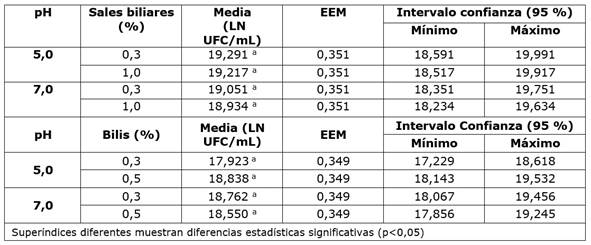 En la exposición a condiciones gastrointestinales simuladas se encontraron aceptables valores de crecimiento entre 2,8 x 10⁷ y 3,3 x 10⁹ UFC/mL y buena supervivencia microbiana de la BAL en la fase gástrica (pH 3,0). En la determinación de resistencia a lisozima, se encontraron diferencias estadísticas significativas entre las diversas concentraciones de lisozima (p<0,05). Respecto a las variables pH (pH 5,0 y 7,0) y sales biliares (0,3 y 1,0 %), correspondientes a la fase intestinal, no mostraron diferencias significativas (p>0,05) entre los niveles evaluados, así como tampoco se observó un efecto de interacción significativo. Lo anterior, demuestra que la variable crecimiento fue similar en todos los niveles evaluados. Para el caso de la bilis (0,3 y 0,5%) y pH (5,0 y 7,0) los resultados estadísticos mostraron que no existen diferencias significativas (p>0,05) (Cuadro 1).