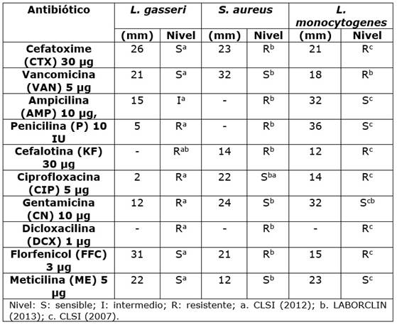 En contraste con lo encontrado en la presente investigación, autores como Gunyakti y Ozusaglam (2019) reportaron para L. gasseri MA-4 un perfil de sensibilidad a ampicilina (10 µg), amoxicilina (30 µg) y penicilina (10 µg) y un perfil de resistencia a gentamicina (10 µg). Según la literatura, las especies de Lactobacillus aisladas de diversas fuentes, se observaron más comúnmente como susceptibles a los antibióticos β-lactamasas como la amoxicilina, ampicilina, penicilina G y cloxacilina (Campedelli et al., 2019), también suelen presentar propiedades de resistencia intrínseca (no transmisible) hacia los aminoglucósidos (amikacina, kanamicina y gentamicina) y el grupo de las quinolonas (ácido nalidíxico y ofloxacina) (Yang et al., 2019). En algunos otros estudios, la susceptibilidad a los antibióticos ha sido como un criterio importante para que una cepa sea un buen probiótico, por su parte, Alarjani et al. (2021) observaron al evaluar la susceptibilidad a agentes antimicrobianos para S. aureus, que más del 35 % de las cepas bacterianas de S. aureus aisladas mostraron resistencia a la vancomicina, la penicilina y la eritromicina. Estudios recientes han demostrado que S. aureus asociados con la infección por el virus de la gripe aumenta el riesgo de neumonía y la consiguiente mortalidad (Jia et al., 2019). Dentro de los antimicrobianos más frecuentemente implicados en mecanismos de resistencia se encuentran las tetraciclinas y gentamicina, seguido por otros antimicrobianos como penicilina, clindamicina, sulfametoxazol-trimetoprim. La prevalencia de estos aislados de Listeria spp. resistentes a los antibióticos en las producciones ganaderas es extremadamente peligrosa, ya que pueden transferirse fácilmente tanto a los seres humanos como a los animales. La resistencia a la tetraciclina en L. monocytogenes se debe principalmente a los plásmidos conjugativos y transposones originados de Enterococcus o Streptococcus, donde los genes de resistencia implicados son tetS, tetM y tetL. Cabe recordar que el proceso de conjugación incluye contacto directo de célula a célula, formación de pares de apareamiento y transferencia de ADN plasmídico a través de un pili conjugativo, además, se menciona que la adquisición del material genético móvil tiene lugar en el tracto gastrointestinal de los humanos (Chokshi et al., 2019).