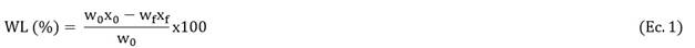 En las que w 0 y 𝑤 𝑓 representan el peso de la muestra antes y después del proceso de OD respectivamente;X0 y Xf representan respectivamente la fracción de agua antes y después del proceso de OD y se expresan en base seca; S0 y Sf representan la fracción de sólidos presentes en las muestras antes y después del proceso de OD.
