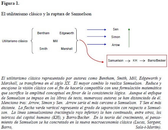 El rectángulo inferior representa la ruptura samuelsoniana, que tiene lugar a finales de los años treinta y comienzos de los cuarenta. Samuelson reduce considerablemente los alcances del utilitarismo clásico 13. Lo despoja de su riqueza filosófica y lo convierte en una relación matemática vacía de contenido. La propuesta de Samuelson domina la enseñanza de la economía y se ha convertido en la sustento teórico de la llamada "corriente principal", aunque este término siempre es ambiguo y confuso. Desde la perspectiva de la NJ los desarrollos más relevantes de la línea samuelsoniana son los de la teoría del capital humano y, especialmente, la versión beckeriana.