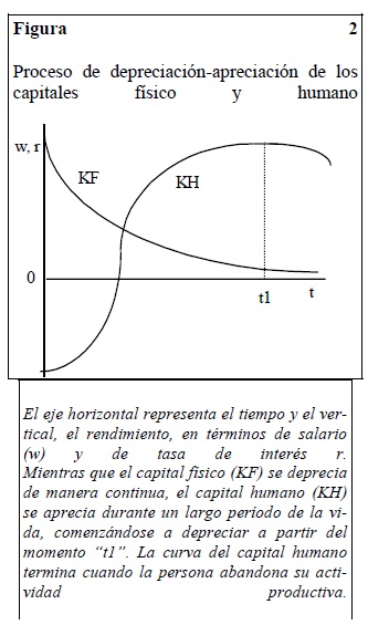 El eje vertical de la figura 2 representa el rendimiento del capital. El salario (w) y la tasa de interés (r) son aproximaciones a los rendimientos de los capitales humano y físico, respectivamente25. La capacidad productiva del individuo tiene un comportamiento a lo largo del tiempo muy diferente a la de la máquina. A la depreciación del capital humano no se le pueden aplicar exactamente los mismos criterios que a la depreciación del capital físico. Mientras que el capital físico tiende a agotarse a lo largo del tiempo, el capital humano se aprecia durante un período de la vida del individuo. La educación, la formación o en el puesto del trabajo, o, simplemente, la experiencia, aumentan el rendimiento del capital humano. La salud, física y sicológica, también mejora durante una parte de la vida.