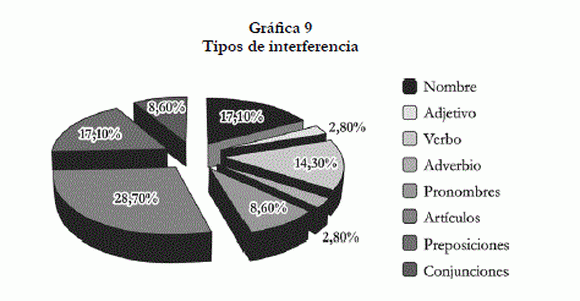En primer lugar, el 28,7% de interferencias se encontraron en la categoría de artículo, seguido del nombre con un 17,1%, verbo con un 14,3%, preposición con un 17,1%, conjunción con un 8,6%, pronombre con un 8,6%, cada una, y finalmente adjetivos y adverbios con un 2,9% de frecuencia cada uno.