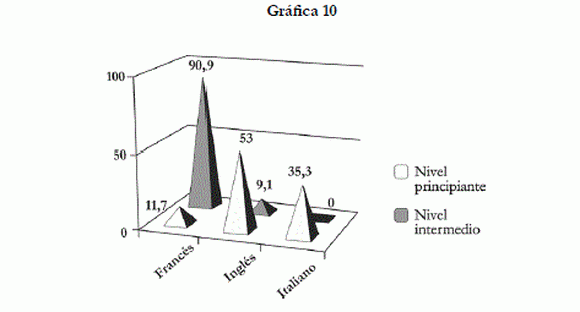 La interferencia se manifiesta según el nivel de formación de los sujetos estudiantes: para los principiantes, la lengua que más interfiere en el aprendizaje de otras lenguas extranjeras es el inglés con el 53%, seguido del italiano con un 35.3% y luego el francés con un 11,7%. Para los estudiantes y las estudiantes de nivel intermedio, el idioma que más interfiere en el aprendizaje de otras lenguas extranjeras es el francés con un 90,9%, seguido del inglés con un 9,1%. La siguiente gráfica ilustra claramente estas proporciones: