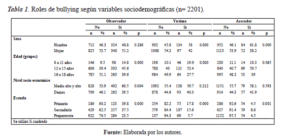 Las preguntas sobre roles del cuestionario fueron para el caso de observador: ¿Has observado que algún estudiante de tu escuela acose a algún o alguna estudiante? En el caso de víctimas ¿Te han acosado otros estudiantes de tu escuela? En el caso de los agresores: ¿Has acosado a algún (a) estudiante de tu escuela?