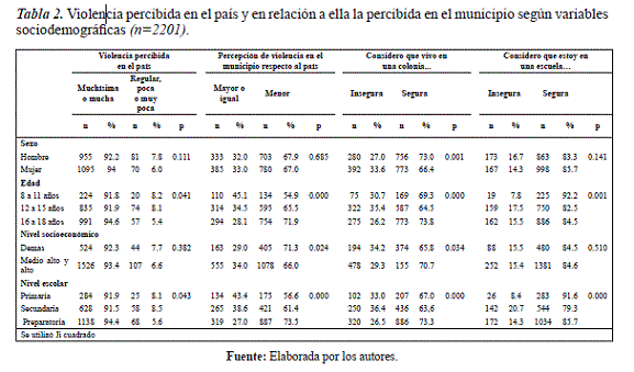 En relación a la percepción de violencia se aplicaron seis preguntas cerradas. Dos preguntas indagaban sobre la violencia que percibía a nivel país y municipal. Las preguntas fueron ¿Cuánta violencia consideras que hay en el país? las opciones de respuesta fueron de tipo ordinal, en una escala Likert, de cinco puntos con opciones de respuesta que se codificaron:, 0=regular, poca, muy poca 1=muchísima, mucha y ¿Cuánta violencia consideras que hay en tu municipio? Cuyas opciones de respuesta se codificaron: 1=mayor que en todo el país, 2=igual que en todo el país, 3=menor que en todo el país. Dos preguntas más indagaban sobre la percepción de seguridad en su entorno más cercano (su colonia y su escuela). Las preguntas fueron: ¿Qué tan segura consideras que es tu colonia? y ¿Qué tan segura consideras que es tu escuela? las opciones de respuesta se codificaron: 0=muy segura, segura, 1=poco segura, segura, muy insegura.