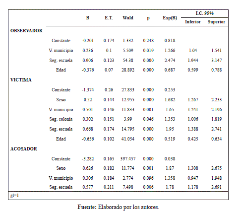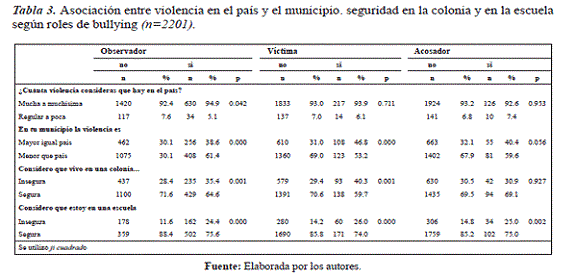 Inicialmente la relación entre violencia y acoso se analizó mediante asociación simple con Ji cuadrado (Tabla 3) donde se puede observar que en la percepción de violencia en el país solo hay diferencias significativas en el observador que aprecia mucha o muchísima en mayor proporción que el no observador. En los tres roles de acoso la percepción de su municipio con inseguridad mayor o igual al país, es mayor y significativa. La inseguridad percibida en la colonia es mayor y significativa la diferencia del observador y de la víctima de quien no lo es. En el caso de la inseguridad percibida en la escuela en los tres roles de bullying hay diferencia significativa mayor que quienes no asumen roles.