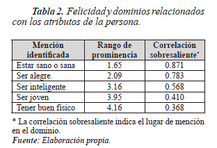 La felicidad y sus dominios con los atributos de la persona. El sentimiento hacia sí mismo es fundamental para cualificar qué tanto se es feliz o desdichado. El sentirse feliz se relaciona con lo que uno mismo representa para sí. El listado que los individuos entrevistados mencionan con mayor relevancia para ser felices es estar sano (tabla 2). Sócrates decía que estar sano es una dicha. Tal idea se encuentra presente también en Schopenhauer (2008, p. 55) quien considera que la salud es el mayor de los bienes: "Con ella todo se convierte en manantial de placer; sin ella, por el contrario, no podríamos disfrutar de un bien exterior, de cualquier naturaleza que sea". En realidad, cuando una persona está sana tiene lo fundamental para sentirse dichosa. Al analizar las respuestas de nuestros adolescentes encontramos que la mención estar sano presenta un nivel de significancia de .0871, mientras que el índice de prominencia es de 1.65. Entre las expresiones que utilizan los individuos entrevistados para referirse a la relevancia de la lista están las siguientes: "Un cuerpo sano, pues la salud, debemos agradecer por tenerla, es algo muy valioso y si nos ponemos a pensar, de ésta podemos desarrollar nuevas cosas; tener salud es tener capacidad para lograr cualquier cosa, para vivir, para sentir nuevas cosas, pues de ésta dependen las metas, las experiencias, la madurez, podemos lograr lo que queramos, lo demás son excusas. La salud es algo muy valioso y que no todos tenemos" (M); "Cuando estoy enfermo no soy feliz y cuando estoy sano es lo mejor, lo más importante de la vida es la vida misma" (H); "Porque si no estás sano no serías feliz y también porque estar sano es la puerta de todo lo demás" (H); "La salud es la base de la felicidad, una persona sana puede hacer lo que más le gusta de la forma que quiera y cuando quiera" (M)3.