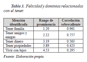 La felicidad y sus dominios con el tener. Aquí se enfatizan dos significados asociados al tener: a) la posesión de bienes materiales (calzado, alimento y casa, por ejemplo); y b) la posesión de bienes inmateriales, por ejemplo, tener relaciones, una familia, amistades, etc. Al respecto, la lista que ocupa el primer lugar de mención en la pregunta para ser feliz es tener familia ( tabla 3). El índice de prominencia es de 1.20, con un nivel de significancia muy alto. Algunas expresiones ilustrativas son las siguientes: "Porque la familia es la base de todo, te apoya y te va a entender mejor que nadie" (M); "Es más importante tener a las personas que quieres y que jamás te cambiarán por cosas materiales. Es muy importante convivir con la familia" (M); "Es lo más importante, el crecer con los que te ven crecer" (H); "Se me ha sido asignada una familia, la cual gracias a ella es que hoy estoy aquí, vivo y agradecido por cada uno de ellos y por mí mismo" (H).