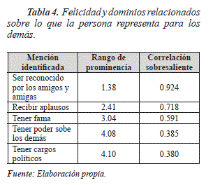 La felicidad y sus dominios sobre lo que la persona representa para los demás. Como seres gregarios, la opinión de los otros también tiene peso al determinar si se es feliz o no. Al respecto, los resultados muestran que en el caso de nuestros interlocutores e interlocutoras encontramos que ser reconocido por los amigos y amigas es valorado como muy importante; el índice de prominencia es de 1.38 con un nivel de significancia de 0.924; ninguna otra mención tiene este peso (tabla 4). Tal relevancia se manifiesta por medio de los siguientes enunciados: "Con ellos se convive mucho y es bueno saber que les importas" (M); "Es bueno que tus amigos conozcan de lo que eres capaz" (H); "Eso te va a dar seguridad de ti mismo, cuando tienes amigos que te reconocen" (M);"Es importante ser valorado por las virtudes y capacidades que tenemos" (H); "Creo que te da gusto que un amigo te reconozca por ser alguien bueno" (M); "Cuando hacemos algo bueno, los amigos siempre nos admiran y quieren seguir tu ejemplo y te sientes feliz" (H).