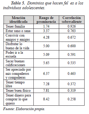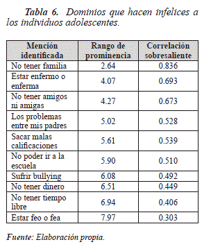 La felicidad y la infelicidad en el yo proyectivo de los adolescentes. Marías (1989, p. 20) afirma que la: "Felicidad es mi felicidad, no solo en el sentido de que tiene que poseer un carácter individual, particular, diferenciado, sino sobre todo en que tiene que tener conexión con el quién proyectivo que es cada uno de nosotros." La pertinencia de esta cita, pensando en que había que particularizar más las preguntas para referirlas a ellos mismos, llevó a cuestionarlos sobre qué los hace felices o infelices. Así, desde su yo proyectivo lo que más los hace felices es el hecho de tener una familia. El nivel de mención arroja una significancia de 0.926, seguido de la mención estar sano que, a su vez, presenta un nivel de 0.763 (tabla 5). Sobre la mención en este dominio se agrupan expresiones como las siguientes: "La familia te apoya en las buenas y en las malas y nunca te dejarán solo y pues, tener familia es un gran privilegio" (M); "Es la raíz de la vida" (H); "Porque la familia te ama y te dan lo que necesitas" (M); "Al momento de convivir con mi familia siento el apoyo y aprecio de todos lo que me hacen estar muy feliz" (H); "Para mí son lo más importante, son el único apoyo que tengo y gracias a ellos disfruto lo bueno de la vida, soy feliz y aprendo de su ejemplo" (M); "Mi familia me ha enseñado al paso de los años la vida de la mejor manera, aceptando mis aciertos y aceptando mis errores, y aunque vivir no siempre es estar feliz, siempre hay un motivo para poder levantarse" (M).