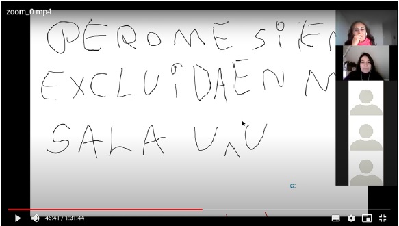 En relación al potencial semiótico, observamos que las formas de participación de las y los jóvenes evidencian su agencia en el espacio virtual multimodal, la que comienza por la decisión de encender o no encender la cámara o micrófono. Esto se asocia, por una parte, al reconocimiento o no de su autoría en las intervenciones y, por otra, a la exposición o no de su ámbito privado. Como adultas/os participantes encendimos las cámaras y esperábamos esa acción por parte de las y los jóvenes. Trasladamos nuestras prácticas semióticas desde la presencialidad a la virtualidad e, inicialmente, concebimos el anonimato como una negación a un otro. Pero en el taller aprendimos que este era un acto de decisión libre: encender o no la cámara, me muestro o no. Este es un primer desafío a las formas establecidas y relaciones de poder.