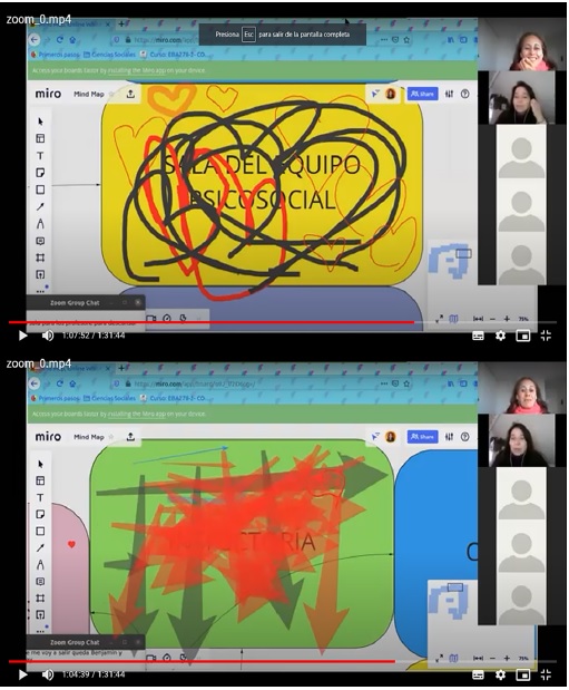 La segunda sesión tuvo cuatro momentos: 1) escala «Cómo me siento hoy»; 2) acuerdos de convivencia; 3) CVEE; y 4) cierre. Para este artículo nos concentramos en el análisis del tercer momento, la CVEE colectiva realizada en pizarra de Zoom y Miro simultáneamente. El objetivo era compartir las experiencias personales de inclusión y exclusión en los espacios educativos reales de cada escuela. Para ello, la pizarra virtual de Zoom permitió a los participantes interactuar con la cartografía presentada como fondo mediante Miro. La dinámica se desarrolló ampliando secuencialmente la representación gráfica de cada espacio educativo.