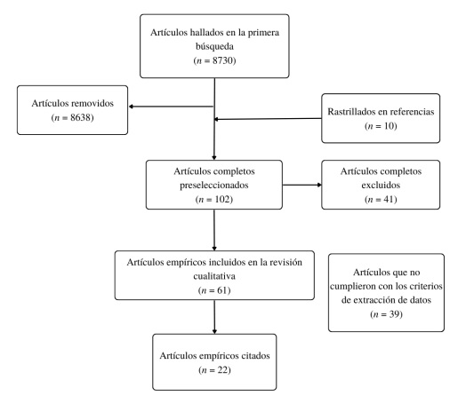 La muestra final estuvo conformada por 22 artículos empíricos: 12 sobre factores del microsistema y el mesosistema, cinco sobre elementos del exosistema y cinco sobre componentes del macrosistema. Estos fueron interpretados de forma independiente utilizando un enfoque cualitativo, identificando categorías teóricas derivadas de los datos mediante la utilización de un método comparativo constante, teniendo en cuenta las siguientes variables de análisis: a) población de estudio; b) país de la muestra; c) instrumento de evaluación utilizado; d) constructo evaluado; e) frecuencia de evaluación; y f) resultados obtenidos. En la figura 1 se observa el diagrama de flujo de la selección de los artículos.