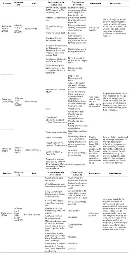 A la vez, solo uno de los estudios evaluó un elemento perteneciente a la escuela (la formación docente), pese a ser este un factor relevante al microsistema infantil (Early et al., 2006). Por otro lado, cuatro estudios analizaron la variable NSE (Conway et al., 2018; Lawson & Farah, 2017; McCoy et al., 2017; Seidler & Ritchie, 2018) y es llamativo que dos de ellos (Lawson & Farah, 2017; Seidler & Ritchie, 2018) tomaron únicamente el nivel de ingreso económico y NFA para categorizar a la variable. Si bien hasta la fecha no existe un acuerdo de indicadores socioeconómicos a nivel mundial que permita la comparación de los estudios entre diferentes países, el personal investigador acuerda que estos dos factores no son suficientes para establecer un NSE (Atkinson & Marlier, 2010). La medición de este factor es muy importante para evaluar su impacto en el desarrollo infantil debido a que es útil para la gestión eficaz de programas a nivel nacional e internacional en relación con el cuidado de la infancia. La cuantificación de los indicadores socioeconómicos es un paso fundamental para establecer de forma concreta el alcance de los programas que intentan palear las desigualdades contextuales y evaluar el impacto de las medidas adoptadas para promover el desarrollo infantil (Chakraborty et al., 2020)