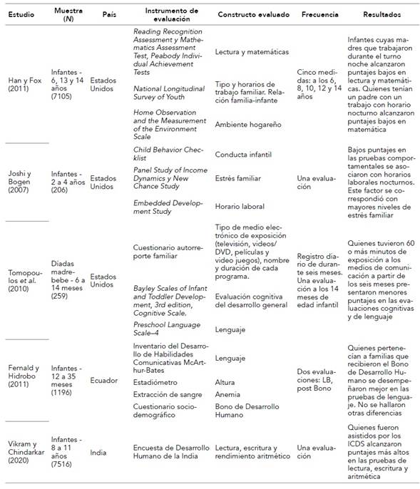 El objetivo de la presente revisión fue recopilar y describir los estudios que mostraron cómo diferentes factores del contexto influían sobre el desarrollo cognitivo infantil.
