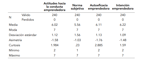 Los datos fueron procesados en el software SPSS (versión 23). En un primer momento se procedió a excluir del análisis los casos duplicados y los datos atípicos por medio del puntaje z (Myers, 2011). Gracias al procedimiento anterior, la muestra se logró establecer en 240 casos. Posteriormente, se realizaron análisis estadísticos univariantes considerando medidas de tendencia central, dispersión y forma para las variables de caracterización y las variables de análisis de la escala de intenciones emprendedoras. Paralelamente, se procedió a establecer un análisis de correlación, con la finalidad de observar asociaciones entre las subdimensiones de la escala de intenciones emprendedoras (Blalock, 1994; Ritchey, 2008).