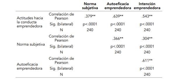 En lo que respecta a las asociaciones entre las distintas variables, se observó la existencia de una relación estadísticamente significativa y moderada entre actitudes, auto-eficacia e intención emprendedora (tabla 2). Cabe mencionar que, si bien es significativa la relación, la norma subjetiva posee una asociación baja con las demás subdimensiones.