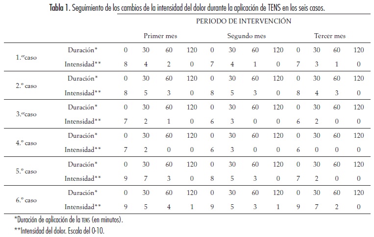 Se fue consignando de forma paralela en una tabla de registro la intensidad de dolor manifestada por cada paciente, al inicio de la sesión, durante (a los 30 minutos de aplicación de la TENS), al final del tratamiento y a las dos horas (contadas a partir del inicio).